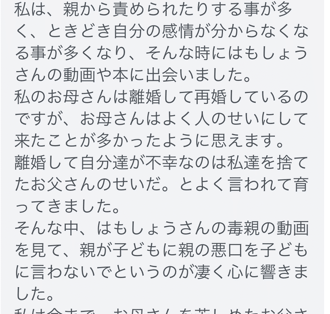 はもしょうさん、初めまして。 突然のメッセージ失礼致します。 はもしょうさんの、動画や、「わたしがわたしを助けにいこう」を読まさせていただきました。 私は、親から責められたりする事が多く、ときどき自分の感情が分からなくな […]