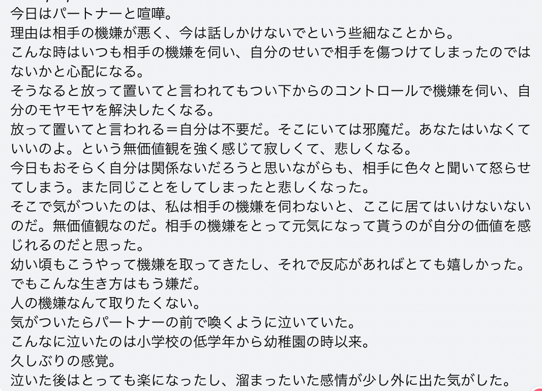 そこで気がついたのは、私は相手の機嫌を伺わないと、ここに居てはいけないないのだ。無価値観なのだ。相手の機嫌をとって元気になって貰うのが自分の価値を感じれるのだと思った。